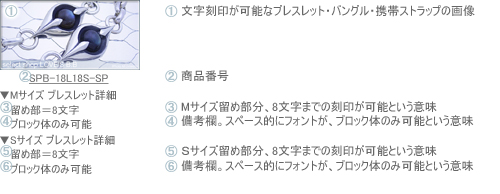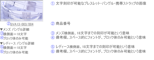 ▼文字刻印の可能な商品 - 文字刻印の可能なペアブレスレットやペアバングル等の一覧と文字数/刻印位置になります。 |
