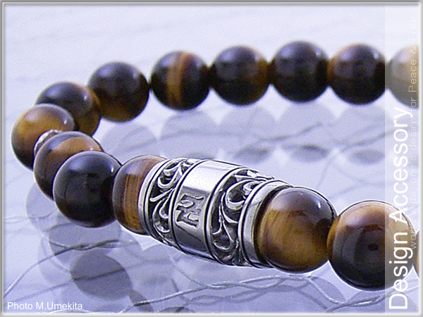 タイガーアイ数珠に、ブラック仕立ての唐草ヘッドを加えたカジュアルなメンズブレスレット。 タイガーアイの石言葉は、「集中力」「直感力」「金運」等になります。 |